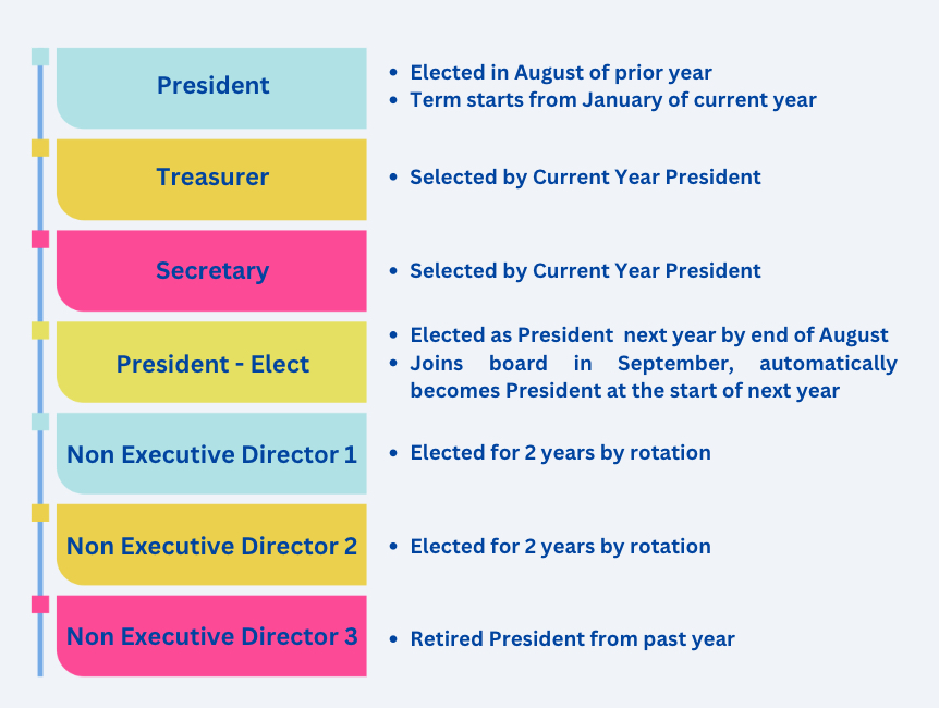 To ensure seamless transitions and sustained momentum, the President is elected each fall and assumes the role of President-Elect until officially stepping into office at the start of the following year. The retiring President automatically transitions into the role of a non-executive director, preserving institutional wisdom and continuity. After serving in this capacity, a one-year cooling-off period is observed before they can rejoin the board or contest in future elections.